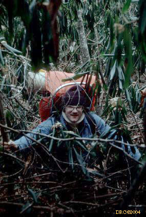 Joe hiking through the Rhododendron (also called
