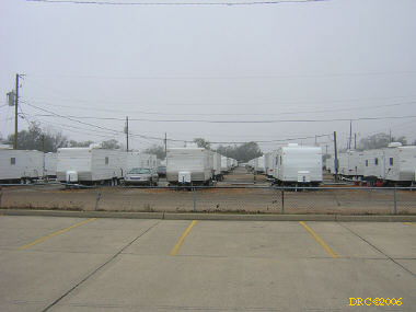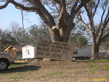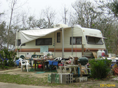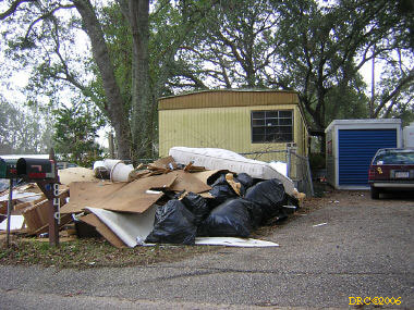 I got up about 6:30 and had breakfast. It was 55 degrees this morning and very foggy. I got on the road about 7:30 and headed for Bayou La Batre. I went to Mr. Bosarge's place where we worked on our last trip. He had a storage pod with his furniture in it, but the debris from the trailer insulation and walls was still in front of the trailer. There was a light on in the trailer so I assume that he was using the trailer or working on it. I took a picture.