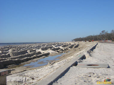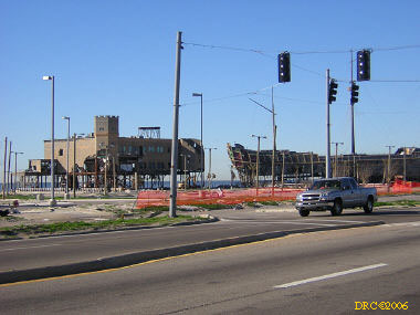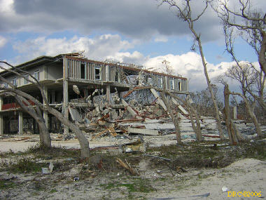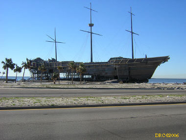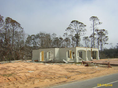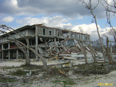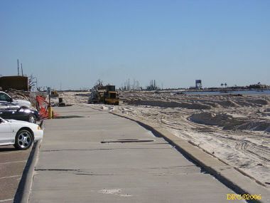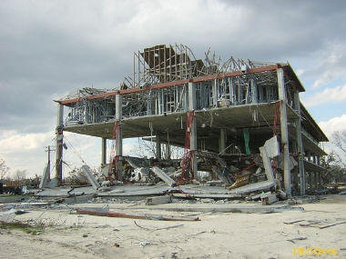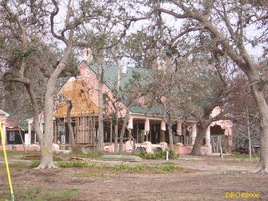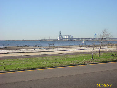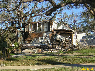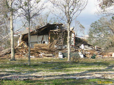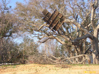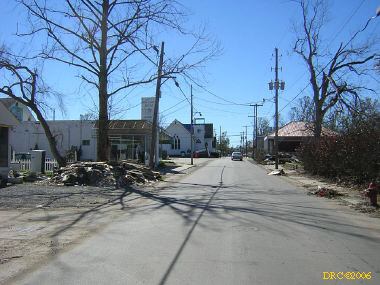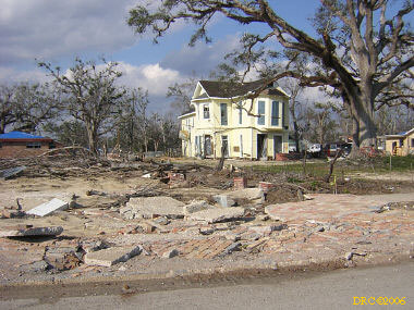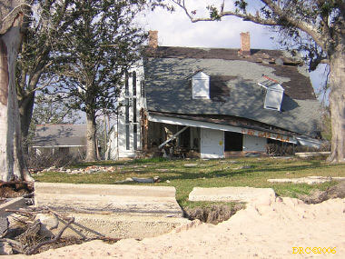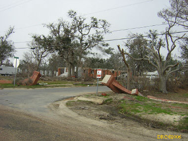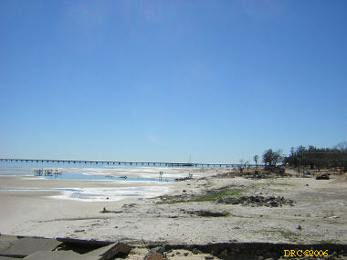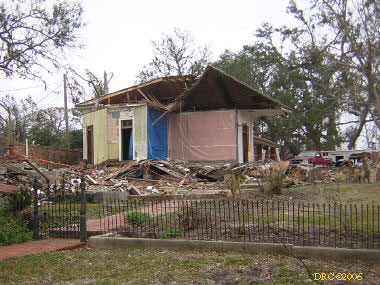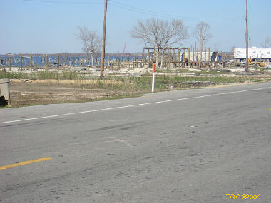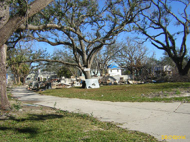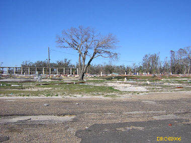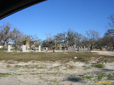 After driving around Ocean Springs, I went on to the Pineville Presbyterian Church (228-452-9902, 4476 Menge Ave., Pass Christian, MS 39571) in Pass Christian ("Chris-tee-ann"), MS. No one was there. I called Lou Marchette (pronounced Marshetty) and he said that he was coordinating work only on the church and that they wouldn't start that until they got all the materials. They had no facilities to house anyone; people would have to stay in the PDA camps. He told me that Dan Spreague, an alder at the church, would contact me about work in the area. I drove on down to the shore. The amount of damage here was even more extensive than at Ocean Springs, if that is believable. Because there were several inland bays, storm surge was able to reach several miles inland. There were so many trees down and houses completely destroyed, it looked like a bombed city in World War II. I took lots of pictures, but after awhile, one destroyed house looks pretty much like another. I was driving around in shock. Damage is so great that very little has been done in comparison (even though a lot had been done). It will take a decade or more to make this place look normal and it will never be the same. There is plenty of chainsaw work and other work to be done here. While driving around, Dan gave me a call. I pulled over and he gave me the names of three coordinators for work in Pass Christian, as follows: Lou Rizardi (228-216-1121), coordinating work groups in Pass Christian; Pierce Sunderman (228-547-7276) works with PDA groups; Travis Todd (334-328-8076) works with Campus Crusades for Christ and other religious groups.