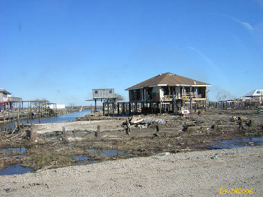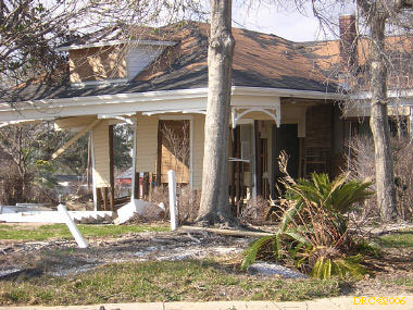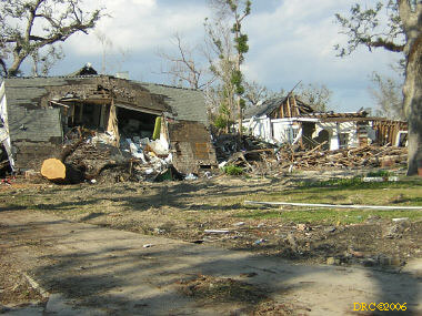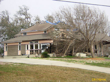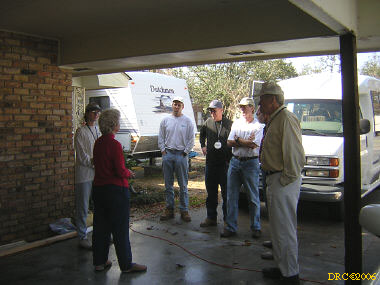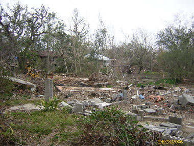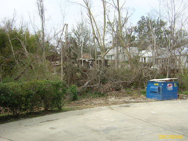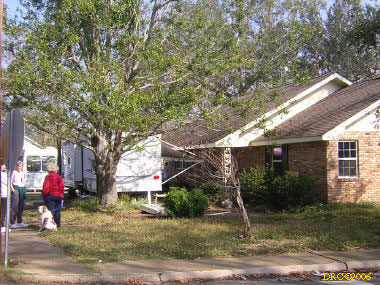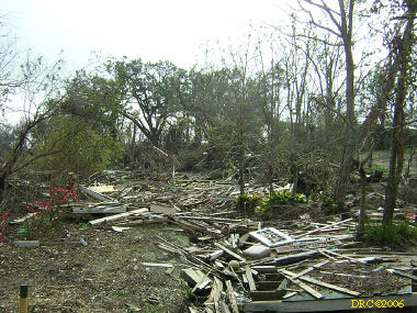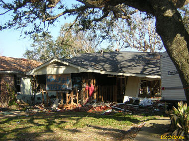 Ed, a volunteer from Oregon, led us to the home site and told us what to do. We met Ms. Browning at her home. She was living in a FEMA trailer in front of her house and her daughter was living in another trailer to the side of the house. They were only two blocks away from the Gulf. She said that water came to about 5 feet in her house and that she lost all her furniture and most of everything, including files with all the old family pictures. Her children's senior pictures which were on the wall were saved, the water just came up to the bottom of the frames. She said that she went to Jackson, MS to stay with her son and family, but returned to her house as soon as they were allowed to go back to the neighborhood. She got her FEMA trailer in December. The city inspectors said that her house was salvageable and gave her a building permit. Many of the houses in the next two blocks toward the Gulf were demolished (I have some pictures, including one where a house had washed up against another). Ms. Browning said that she had a small backyard full of toys wash in from somewhere and a roof had washed into her front yard. She said that her brother (or brother-in-law?) and his son stayed in a house nearby and the storm surge filled their house. They had life preservers on and floated up to the roof where they only had a foot or so of breathing room. Heavy furniture floated up against them as the water rose and pinned them, one at a time against the wall. The free person would move the furniture from the pinned one and then it would happen to the other one. They pushed the couch down a hallway and wedged it in so that it would pin them any more. After three hours, the water receded to the point that they could touch the floor.