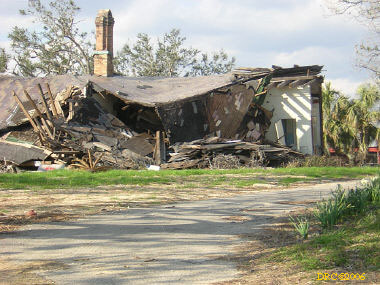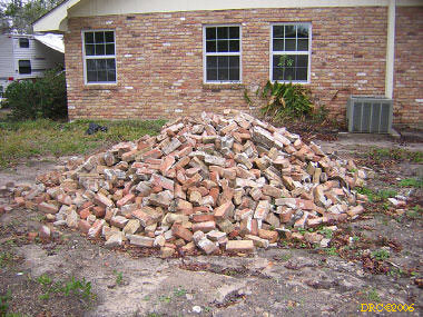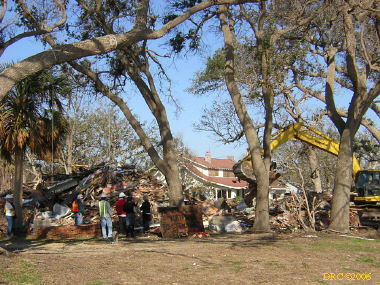We started work. The guys from Jacksonville broke up into teams and started dry walling. Ms. Browning took me into the sunroom and told me that paneling needed to be taken down from the upper part of the walls (it had already been taken down to the top of the windows by another group). I asked her where she wanted us to put the debris. She said out front between the sidewalk and the curb. She mentioned that she had a large pile of bricks in the side yard that the city wouldn't pick up and that the pile should also probably be moved to the front. The only problem was, there was lots of broken glass in the front that should be removed first. The Jacksonville ladies started removing the glass from that area, which was a very tedious job; some of it had to be dug out of the muddy ground. After picking up some litter from the yard, I went into the sun room and started removing the paneling. I carried out the debris and pounded the nails down so that no one would step on a nail. I found a lot of cockroach droppings, mouse nests with leaves, pine needles and bits of insulation on the horizontal lumber in the walls. This had to be cleaned out too. I brushed it out with a broom to remove the big pieces and then went back with a shop vacuum to get the rest. I then swept off the ledges around the room. Another fellow and I then swept the floor and put the trash in a trash bag and carried it to the front. After carrying out other trash from inside the house I went out to look at the large pile of bricks. It looked like a day-long job to move them to the front. Ed said that he would bring a wheelbarrow for us to use tomorrow. By then the men had almost completed putting up drywall. We were winding down for the day. Ed told me that I should walk down by the seashore and see some of the destroyed houses. Grace, one of the pastors of Riverside, and I walked down to see these houses. She was from Virginia and went to William and Mary for college; she also lived in Danville, KY for awhile and liked the rolling hills. She said she missed the ocean while living there, though. Many of the houses that had been destroyed had already been demolished. I took a picture of one being demolished while we were there. We then walked back to Ms. Browning's and we all left from there. On the way back, I noticed that the First Presbyterian Church of Pascagoula was just a few blocks away from Ms. Browning's house. I wondered why the church in Gautier was helping Ms. Browning and this church wasn't. There probably was some coordination between the two groups. I'll ask about that tomorrow, if I remember.