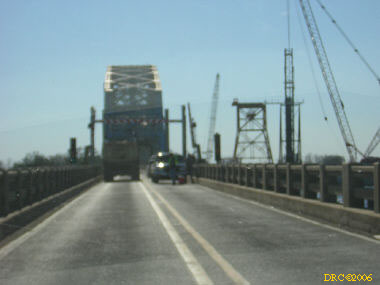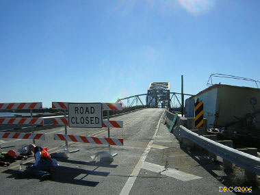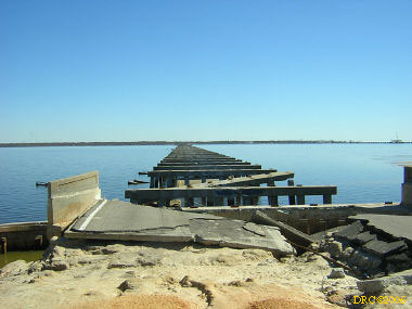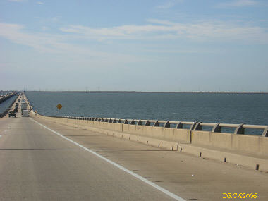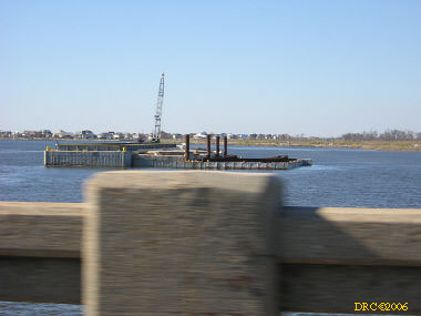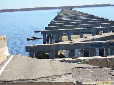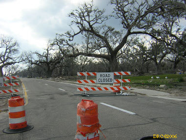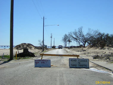 Then I headed west on US 90. Storm surge had covered the road and there were washed up mattresses, cars, trailers, boats, etc. on the side of the road. I continued driving down the road and entered Louisiana. The road crossed several bridges and across several narrow and very shallow spits of land over a course of about 10 or 20 miles. The land was between Lake Pontchartrain and Lake St. Catherine and included the communities of Pike Fort and Greens Ditch. Storm surge was very strongly felt here. All the houses along this road were washed away by the surge. All that was left were thousands of pilings. Boats were stranded here and there. As I got close to New Orleans, I came to a large bridge at a place called Chef Menteur and in front was the large sign "Bridge Closed." I talked to some fellows in hard hats and fluorescent vests when the bridge would be opened and they said that they didn't know. They were doing "Right to Entry" work for the Army Corps of Engineers. They were actually working for a power company working for the Corps. Right to Entry gives workers permission to enter property to do work. Anyway, I took a picture of the bridge and turned around and drove back across the lowland. After crossing the last body of water, I turned onto LA 433 to Slidell. It traversed more lowland with damaged house. Eventually I came to the outskirts of Slidell and I-10. I got on I-10 and headed for Mobile, a two-hour drive.