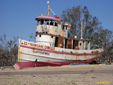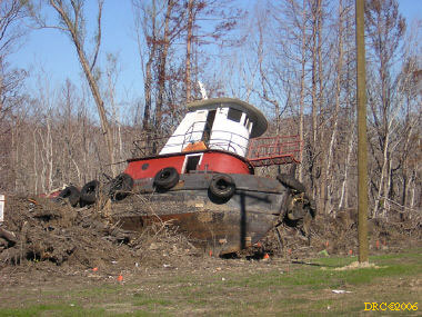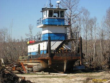 view of commercial fishing boat washed onto land, I-10 near Pascagoula; taken through windshield while driving