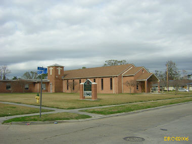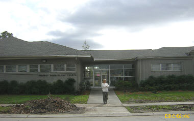 I went to the First Presbyterian Church of Slidell (643-0871) at 1041 9th Street, Slidell, LA. There I met Milton "Milt" Means (985-707-8333, means13@netzero.com) who is the Presbyterian disaster relief coordinator for the Slidell area. He was originally from Pittsburgh, PA. He said that their church could house 40 to 50 people. They have cots, a laundry, and kitchen. Volunteer workers could use some of the food that they had there or they could go to the grocery and buy their own. They had two showers, one in the men's restroom and one in the women's. I took pictures of the dorm rooms, the laundry, and the kitchen. He said that most of their requests were for sheet rock work, mucking out, wheelbarrow work (moving furniture and debris) and that there was still some yard work to do. He also gave me the names and addresses for coordinators on the west and east bank in the New Orleans area. He left before I could get his picture, but I did get a picture of the outside of the church.