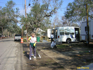 I got to the Parkway Presbyterian Church (6200 Camphor St., Metairie, LA 70003, 504-733-1644) by about noon. The pastor of the church is Tom Oler (tom@ppc.nocoxmail.com, home: 504-887-9270). He wasn't there when I arrived. I talked to Jackie Hezeau ("Hayzu"), the secretary at the church office. She said that I needed to talk to Cindy Lugo who would be back momentarily. During the hurricane, Jackie's husband told her to leave with the rest of her family and stay in Houston till the hurricane was over. He stayed with the house; it had never flooded. This time it did, they had 16 inches of water which was just enough to ruin everything. The water took 24 hours to recede. Jackie and her husband and son mucked out the house in one and a half days, but they have to wait for all new electrical wiring of the house. She lives in a FEMA trailer in her front yard.