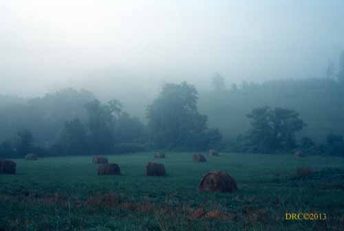 hay stacks in fog,