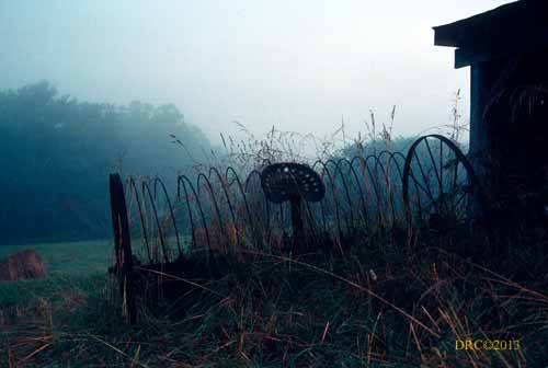 barn in fog, field with