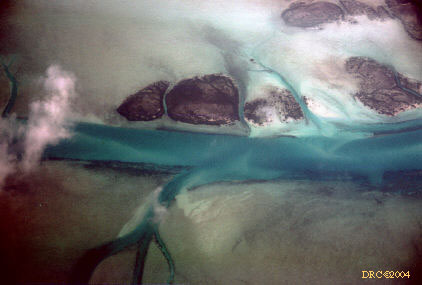 - island and tidal channel, through the clouds